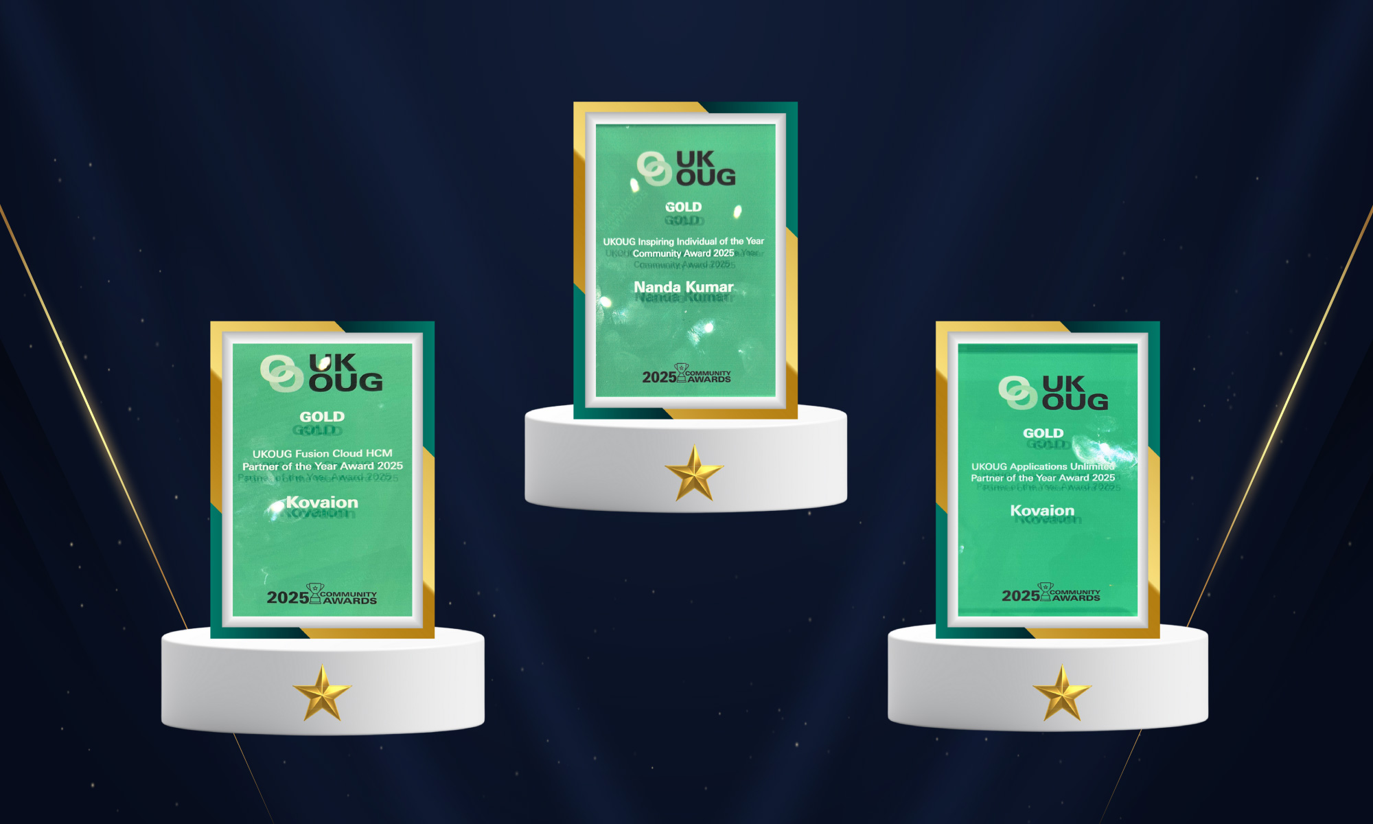 Kovaion Consulting is honored to have been recognized with multiple prestigious gold awards at the UK Oracle User Group (UKOUG) Community Awards, including UKOUG Applications Unlimited Partner of the Year 2025, UKOUG Fusion Cloud HCM Partner of the Year 2025, and UKOUG Inspiring Individual of the Year 2025 (awarded to our Founder & Director, Nanda Kumar). These accolades, uniquely voted on by Oracle customers themselves, serve as powerful, independent validation of the trust, innovation, and tangible value we deliver through partnership. Furthermore, the individual recognition of our founder’s leadership underscores our team-wide commitment to excellence within the Oracle ecosystem, reinforcing the deep expertise and collaborative spirit we bring to every client engagement.
