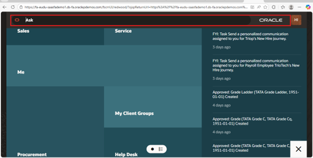Oracle Fusion Cloud Applications continue to evolve by introducing modern user experiences that simplify navigation and improve productivity. One such enhancement is Home with Ask Oracle, a modern home page and global navigation experience that enables users to search, navigate, and access applications, tasks, and information from a single interface.