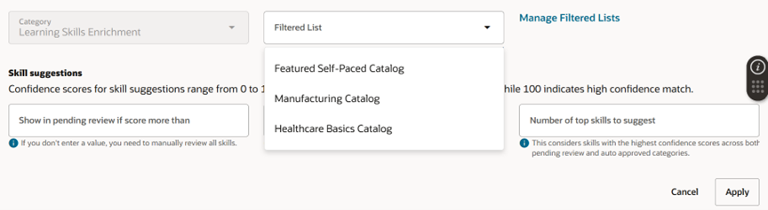 - Select a Filtered List to define applicable learning items (e.g., catalog/category)