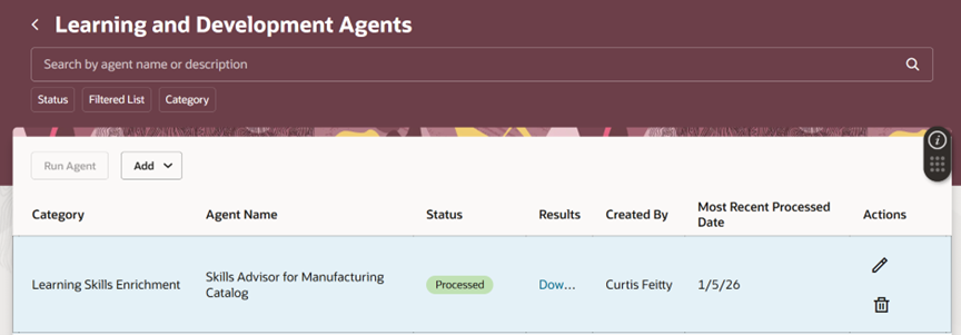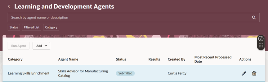 As organizations transition towards a skills-based workforce, the need to intelligently manage and enrich learning content has become critical. Oracle Learning Cloud introduces Learning and Development Agents, which leverage AI-driven capabilities to automate skill tagging, content enrichment, and catalog optimization.