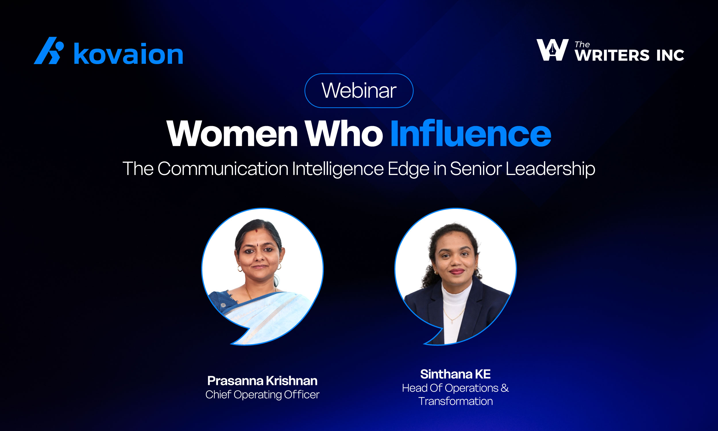 Kovaion is pleased to share that Prasanna Krishnan, Chief Operating Officer, and Sinthana Elavarasan, Head of Operations & Transformation, were part of the panel discussion at the webinar “Women Who Influence: The Communication Intelligence Edge in Senior Leadership.”